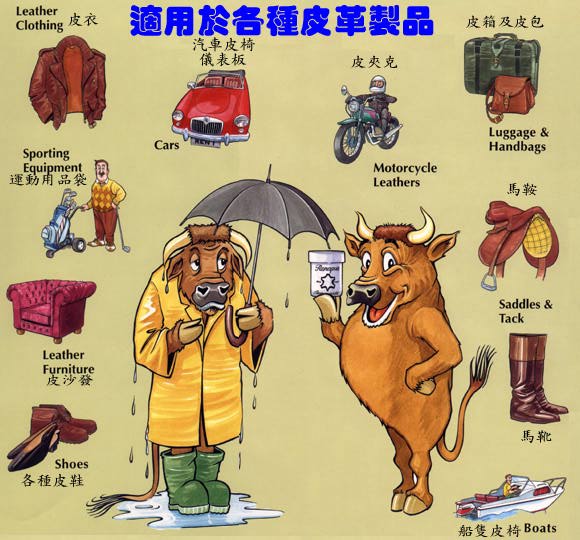 適用範圍: ■ 適用真皮、仿皮製品,如皮鞋、汽車皮椅、皮沙發、皮衣、皮箱、皮包、皮椅、皮夾克、皮褲、馬靴、馬鞍、高爾夫球鞋等;也可用於乙烯基製品如儀表板、保險桿、座墊及木質古董藝術品等。 |